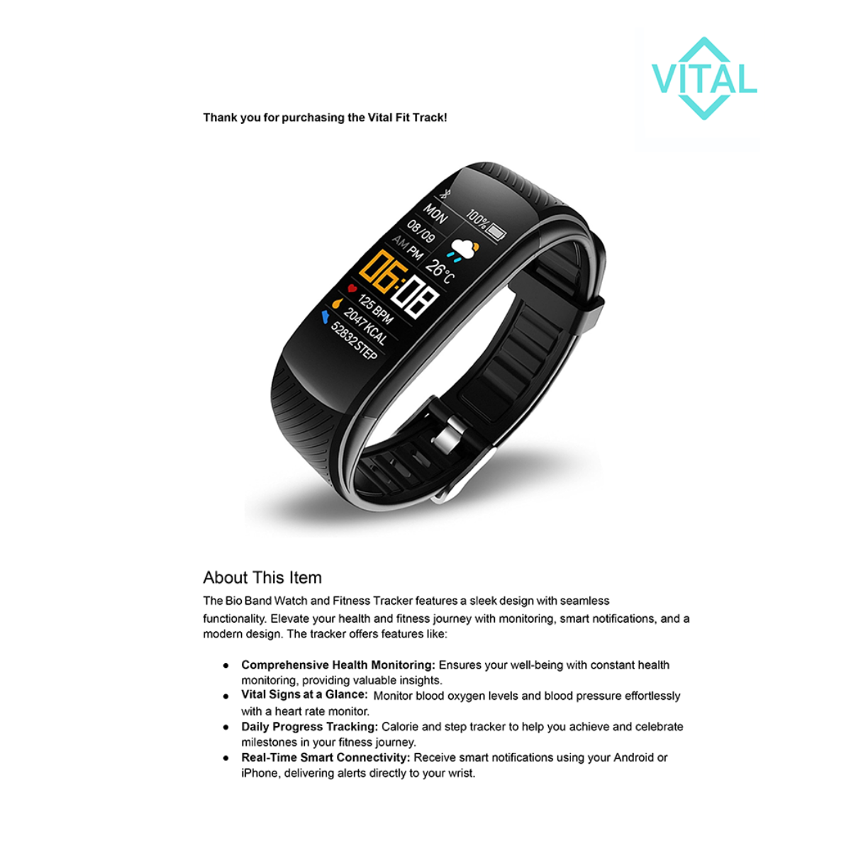 Stay fit, stay connected, and stay focused with Vital Fit Track – your everyday wellness companion.